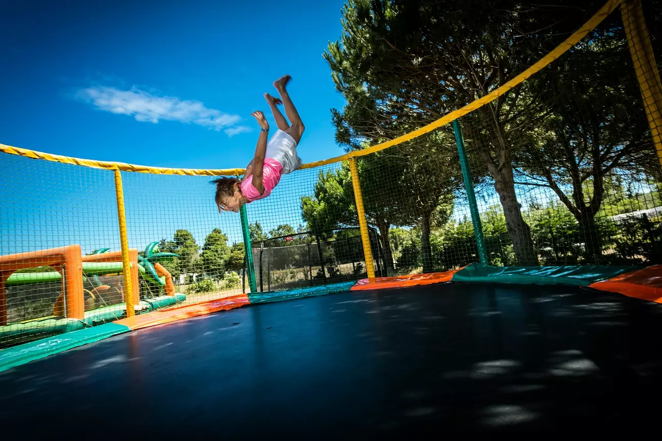 Børnene har til rådighed 2 legepladser med trampoliner, oppustelige strukturer, abebro, rul og gynger.