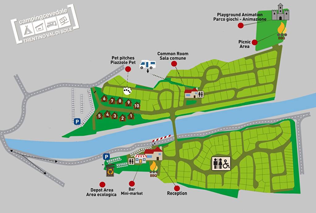 Set in the heart of Europe and the Italian Alps, the campsite is located in the Val di Sole (Trentino) at 879 m above sea level. The campsite lies in a quiet pine-wooded area 500 m away from the town centre of Fucine di Ossana.